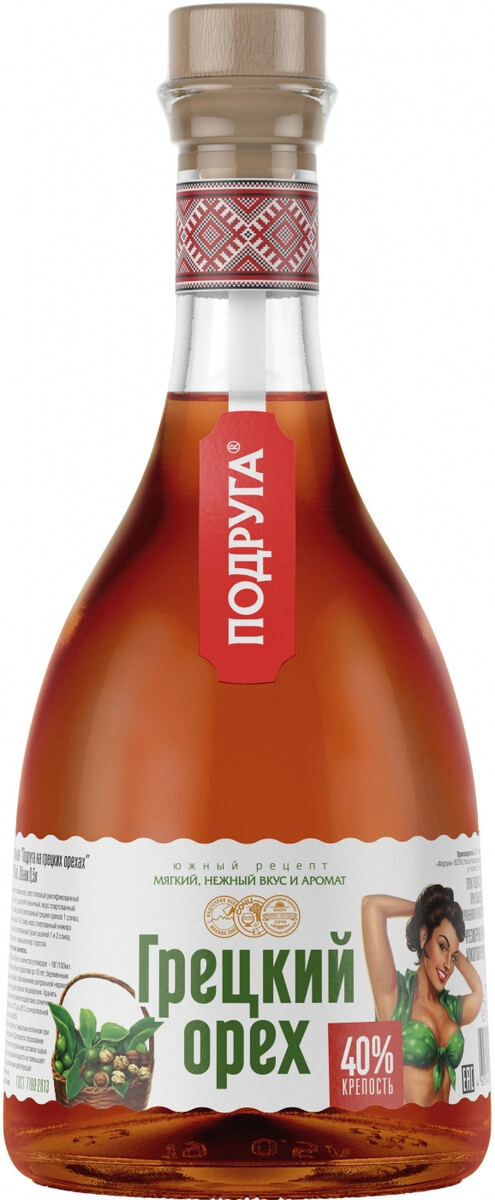 Ликер Подруга Грецкий Орех представляет собой традиционную кубанскую настойку горького типа, произведённую заводом Фортуна в России. Напиток создан на основе спирта класса Люкс и специально подготовленной воды с добавлением спиртованного настоя грецкого ореха, что формирует характерную ореховую ароматическую палитру и тёплую янтарно-коричневую окраску. Технологический процесс реализован на высокотехнологичном оборудовании с использованием фракционного отбора спиртов и трёхступенчатой очистки воды, что подчёркивает стремление производителя к чистоте рецептуры. Вкус ликёра насыщенный, интенсивный, терпкий и согревающий, с долгим стойким послевкусием, аромат выраженно ореховый с древесными оттенками. Рекомендуется подавать с соленьями, закусками и блюдами русской кухни; оформление этикетки выдержано в стиле pin-up, отсылающем к советской эстетике. Завод Фортуна широко представлен на юге России и осуществляет экспортную деятельность, что подтверждается участием продукции в конкурсах и полученными наградами.